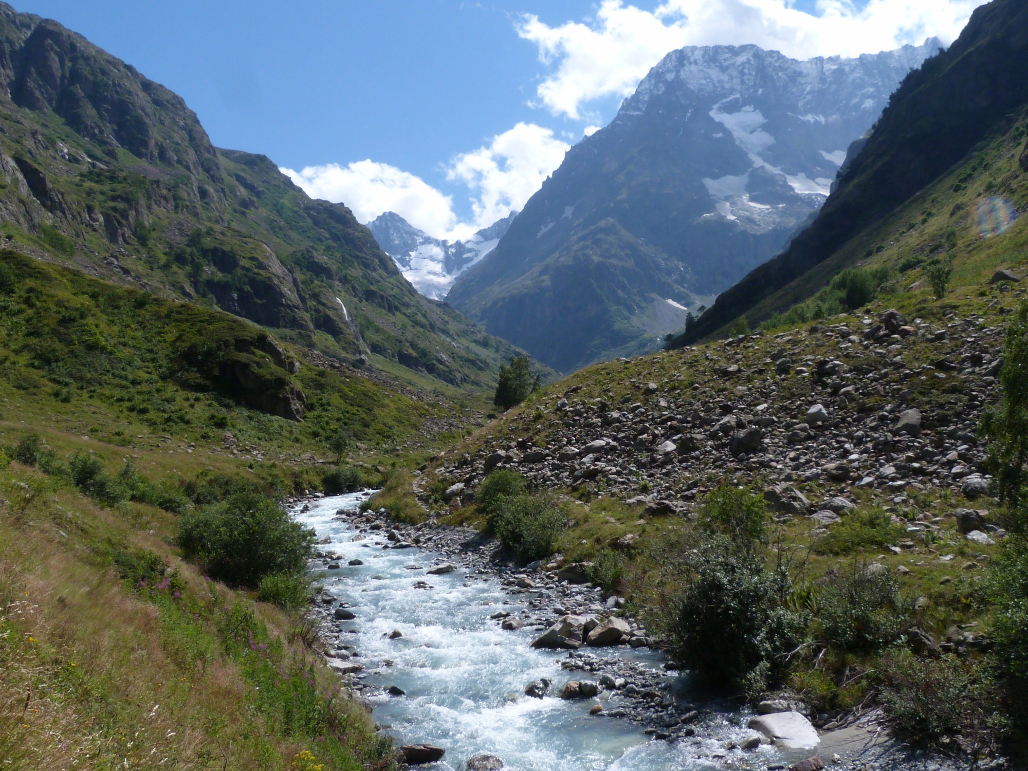Au départ du Pont des Rajas, magnifique pont de pierre en dos d’âne du XVIIe siècle traversant le torrent du Vénéon, direction le vallon des étages…
