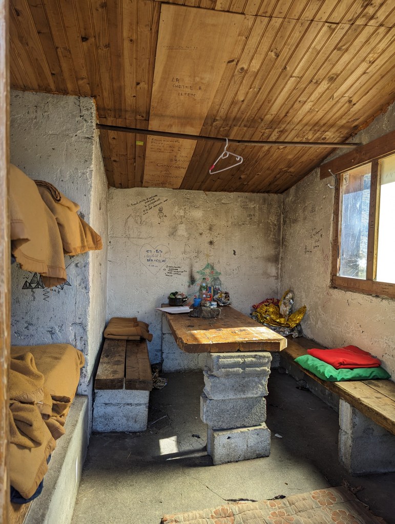 Quelle merveilleuse cabane posée au bord des lacs, 4 couchages, 4 matelas, pas de poêle, table et bancs sur parpaings.