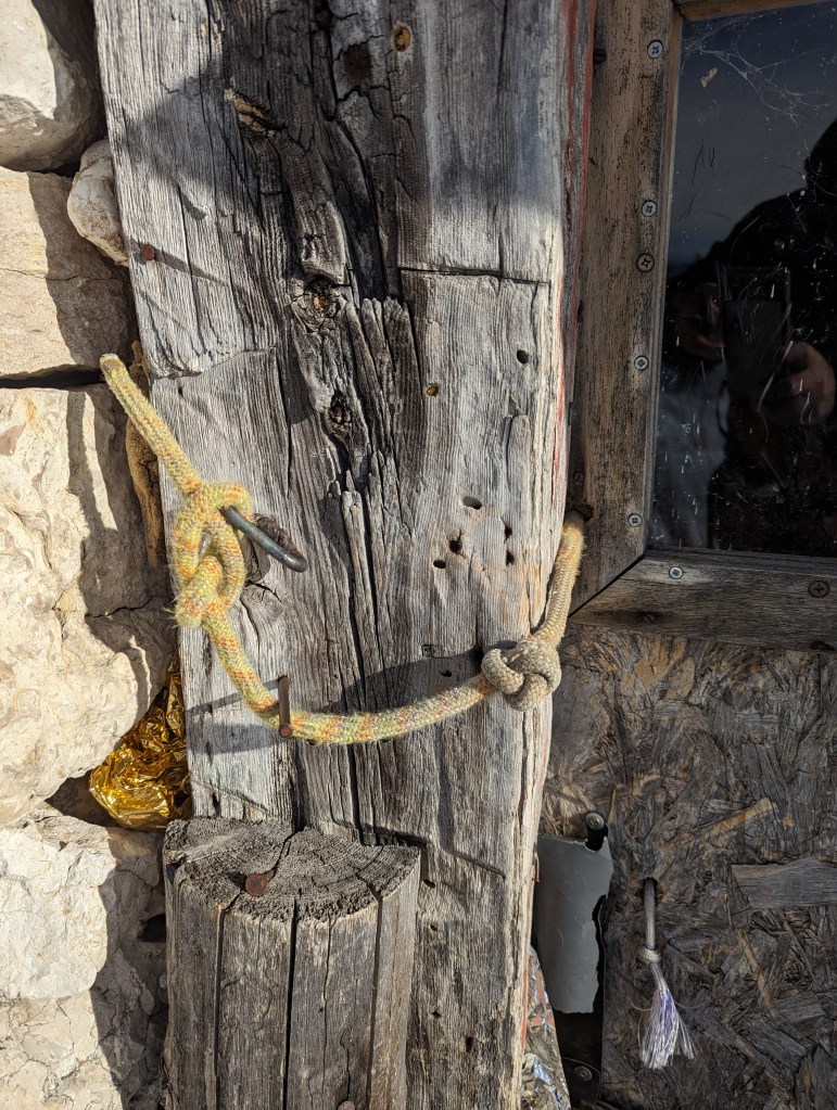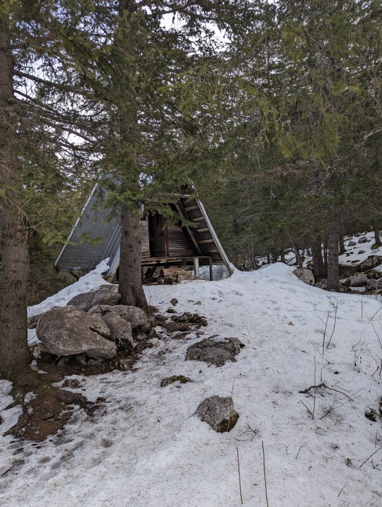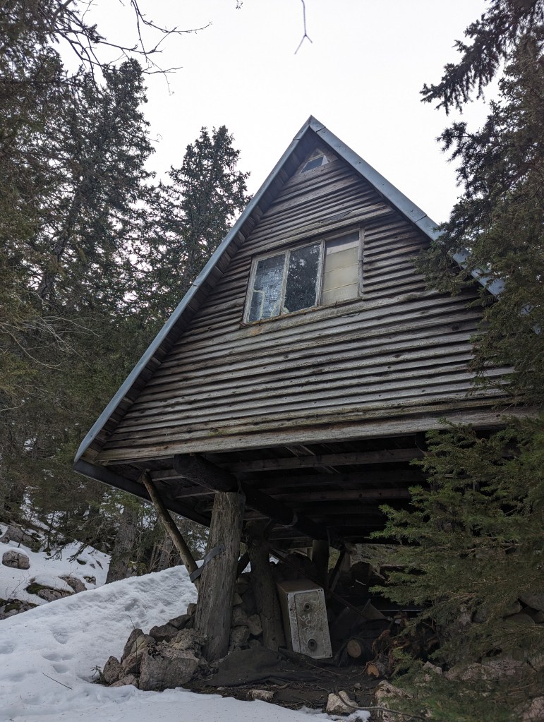 De forme triangulaire, elle reposait sur quelques pilotis et surplombait l’ouverture béante d’un scialet. J’ai posé mon sac sur la terrasse. La construction très sommaire avait été bâtie par les spéléos qui exploraient régulièrement la grotte. A l’intérieur, table et bancs, à l’étage, un peu de place.