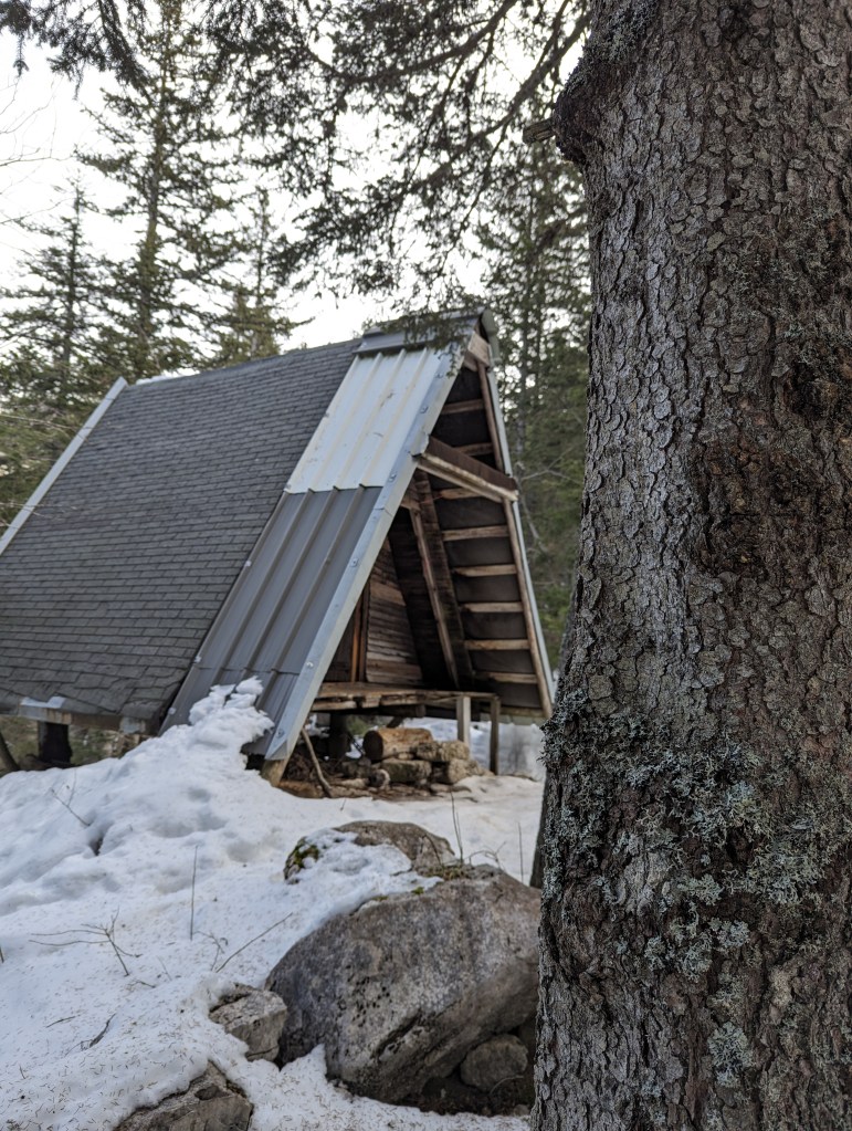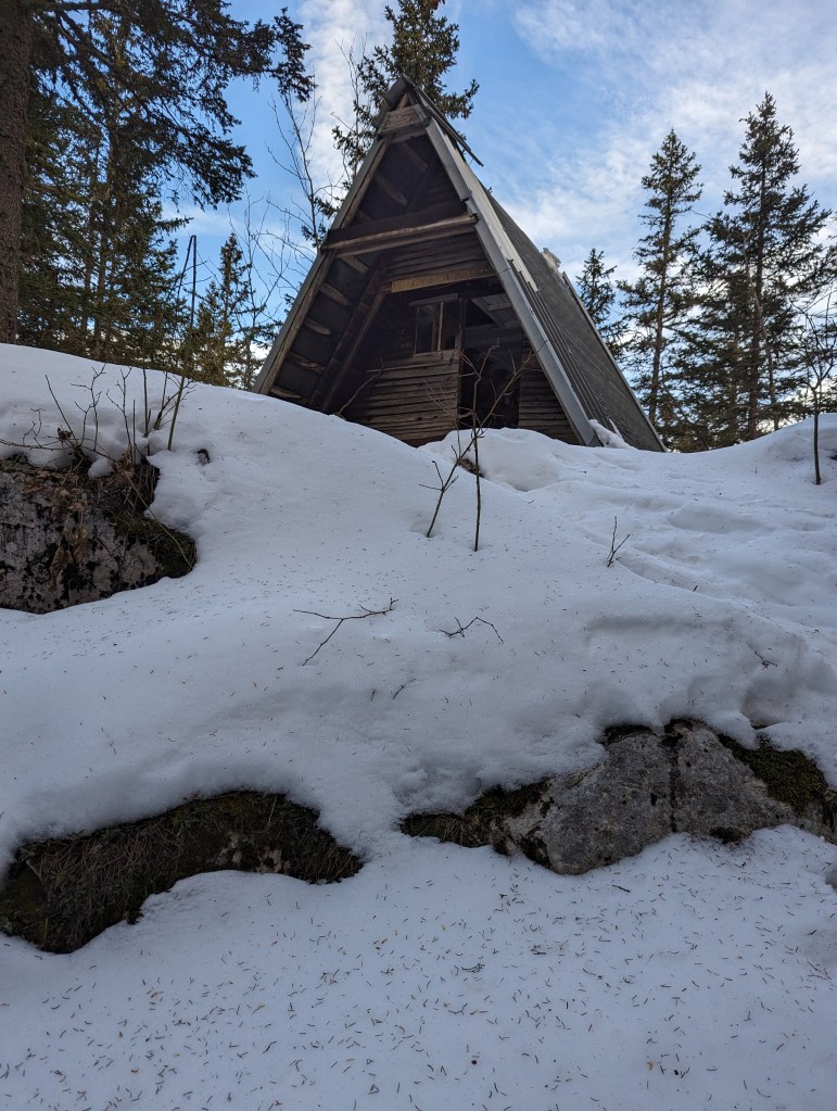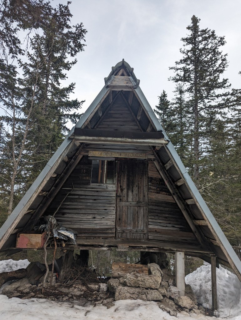 Au début de l’hiver, je me suis mis en tête de gagner une cabane qui tente de rester confidentielle malgré sa présence sur les cartes IGN. Non localisée sur refuges.info ou sur les topos en ligne, il fallait bénéficier des informations d’un initié. A mon habitude, j’étais parti tôt. La veille, la neige était tombée en abondance. Je me suis garé sur le parking de la station de ski encore déserte. Les raquettes accrochées au sac à dos, j’ai entamé l’ascension sur le chemin forestier. A ma gauche, sur la piste vide, des skieurs de rando attaquaient la pente de face. De mon côté, sur le sentier, ce n’était pas simple. Le sol était glacé, glissant et je rechignai à enfiler les raquettes. Je devais m’accrocher à mes bâtons et me maudissait ne pas avoir penser aux crampons. Concentré sur mes pas, je ratais une bifurcation et négligeais de regarder mon GPS. Une fois au col, je me suis rendu compte, qu’idéalement, il aurait fallu opérer un demi-tour. Revenir sur mes pas m’est insupportable, cette obsession de la boucle m’avait plusieurs fois mis en difficulté. Alors après avoir étudié la carte, j’optais pour cheminer sur la crête pour tenter de rejoindre un peu plus loin un sentier qui était bien plus bas. Le manteau neigeux était très épais, je progressais péniblement, même avec les raquettes. Par chance, j’aperçus des traces qui semblaient partir dans la bonne direction. Malheureusement, celles-ci disparaissaient souvent et il me fallait les chercher, parfois longuement. Il me fallut deux bonnes heures pour retrouver l’itinéraire qui, en principe, menait à la cabane. J’étais déjà très fatigué, le temps passait et mon objectif d’atteindre l’abri et d’en rejoindre un deuxième paraissait compromis. Heureusement, le chemin en sous-bois n’était pas trop raide et j’avançais à bonne allure. La cabane s’est dévoilée au dernier moment, dans un virage.