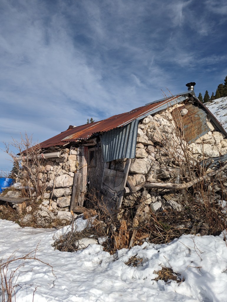 Je finis par arriver dans un vallon, la cabane était posée là, sur la pente, à moitié ensevelie par la neige. Avec ses murs de pierre irrégulier et son toit en tôles, elle semblait bien fragile. A l’intérieur, une cheminée, une petite table, une étagère et des bat-flancs, au sol de la terre battue. Un peu ouverte aux quatre vents par son isolation plus que perfectible et sa rusticité, elle avait un charme fou. Je me suis assis sur le bat-flanc. Selon la carte, il y avait un peu moins de kilomètres pour le retour et plus de 400 m de dénivelé négatif, ce qui n’était pas à sous-estimer dans ces conditions. Là aussi, personne n’était passé avant moi, j’allais encore devoir labourer les champs de neige. Dehors, on n’y voyait pas à dix mètres. J’eus un moment de découragement. Je m’en voulais de mettre mis dans cette galère.