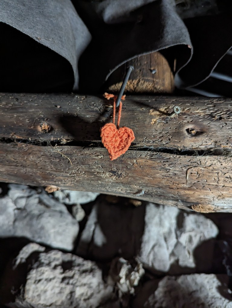 C’est à ce moment-là que j’ai vu le petit cœur orange en crochet suspendu à un clou. C’est une amie qui les confectionne. Elle les dépose dans toutes les cabanes. Je me suis senti moins seul et j’ai retrouvé le sourire. Partir en solitaire ne manque pas d’avantages mais comporte un défaut majeur, on ne peut compter que sur soi-même pour prendre une décision, ce qui laisse parfois place à des doutes profonds. Je suis parti ragaillardi, presque le pied léger, libéré de mes ruminations. J’étais soudainement très heureux d’être là, l’effort ne me pesait plus et je profitai du moment. Quelles étaient belles ces cabanes ! J’avais hâte de rentrer chez moi, de raconter tout cela et de montrer les photos. Cet été ou au printemps, je reviendrais, cela me tient à cœur.